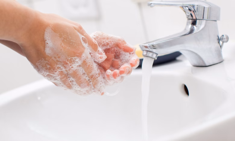 Dann ist das Abspülen dran. Wer sich auf einer öffentlichen Toilette die Hände wäscht, schließt den Wasserhahn dann am besten mit dem Ellenbogen oder einem Einweghandtuch – damit nicht gleich die nächsten Keime auf den Fingern landen.