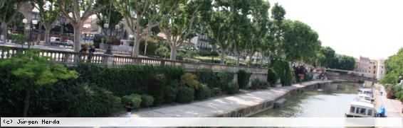 Buntes, oft afrikanisches Markttreiben spielt sich im Schatten der Platanen am Ufer der Robine ab. Ein Rundgang ab dem Rathausplatz vorbei an der possierlichen Fußgängerbrücke an der Promenade des Barques bis zum Pont de la Liberté können wir empfehlen – am anderen Ufer des Canal de la Robine hat sich wieder ein französischer Architekt an einer Kreativlösung für eine weitere stählerne Markthallenkonstruktion versucht.