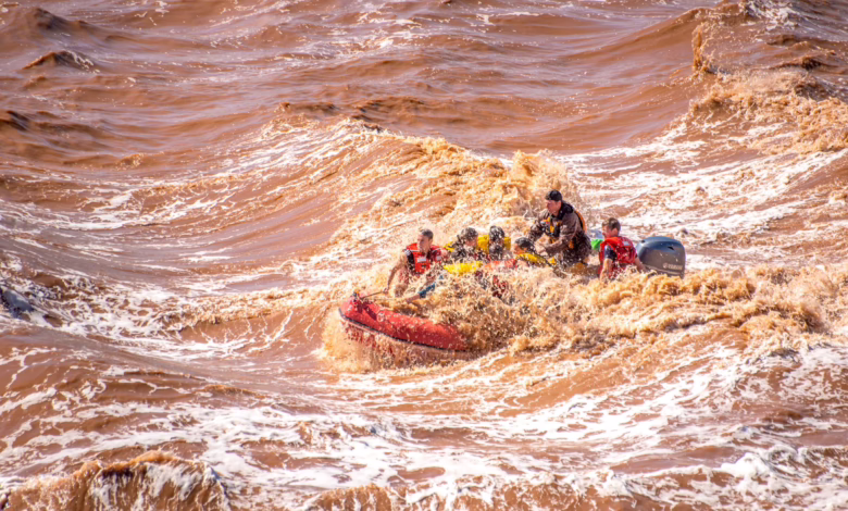 Alle wirken froh, als sie es zum Auftakt der Tour bis zum Schlauchboot geschafft haben. Aber keine der Frauen weiß, was jetzt passieren wird. Rafting in Kanada oder anderswo – dabei geht normalerweise paddelnd über Stromschnellen. Aber das angekündigte «Tidal Bore Rafting»?