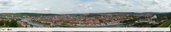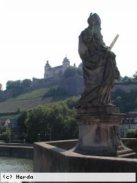 „Thomas schwelgte in der abendlichen Frühlingsatmosphäre, genoss die alte Stadt am braun und träge dahinfließenden Main, den er von der Innenstadt kommend, zum Brückenbäck hin überquerte. Er freute sich auf Karin und gönnte sich vorher noch einen Blick auf den Fluss hinunter, der so stetig all die Jahre über das kleine Wehr unterhalb der Brücke mit einer Gleichmütigkeit, von der er sich viel abschauen könnte, dahin strömte. Egal was passiert ist, der Main strebt unerschütterlich vom Fichtelgebirge kommend hin zum Rhein und dann in die Nordsee. Da konnte kommen, was mochte. Auch als während der Bombardierung am 16. März 1945 ganz Würzburg in wenigen Minuten von der Royal Air Force zu Schutt und Asche verbrannt worden war. Er floss unbekümmert, auch wenn sich an lauen Frühlingsabenden viele Pärchen in den Nischen im Schutz der Steinheiligen küssten, so wie heute. Neben dem Heiligen Burkardus hatte Leonie an einem Abend wie diesem auch ihn, Thomas geküsst. “ [S. 161]
