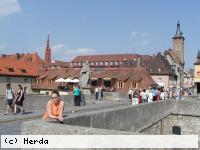 „Auf der alten Mainbrücke war kaum ein Durchkommen an diesem lauen Frühlingsabend. In beide Richtungen strömten kleine Gruppen jeden Alters. Touristen ließen sich in der Abenddämmerung neben einem der zwölf Brückenheiligen fotografieren, was nicht so einfach war, weil immer jemand ins Bild lief.“ (S. 161)
