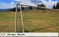 Wer von oben in diese Dorfidylle einfährt kann einfach nicht anders, als spätestens unten an einem der beiden Bolzplätze die Bremse reinzuhauen. Die beiden einzigen Lebewesen: zwei Wanderer, die möglicherweise auf einen Bus warten. Schon bald aber liegen sie hinter der Kirchenmauer und vor dem romanischen Gotteshäuschen mit dem schiefen Campanile daneben.