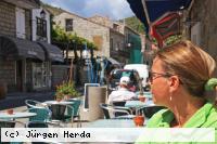 Gemessen an Carbini macht unsere nächste Station, das Großdorf Levie, einen geradezu städtischen Eindruck – wir parken an der dominanten, ewig langgezogenen Pfarrkirche mit dem hohen Campanile. Leider ist sie verschlossen, so dass wir das elfenbeinerne Kruzifix nicht bewundern können. Wir laufen hoch zur belebten Hauptstraße des Ortes, biegen bei der Büste rechts ab und lassen uns in die Stühle vor der erstbesten Bar fallen. Der Café Creme, würzig wie Südkorsika, ist nicht der Rede wert, dafür das Schauspiel gegenüber. Immer wieder wechselt unser Barbesitzer die Straßenseite, palavert mit Kollegen anderer Bars und Geschäfte, während der einzige Gast innen die Stellung hält.