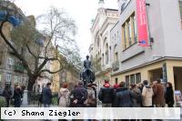 „Zu Beginn des Kriegsjahres 1917 wohnte hier Franz Kafka in zwei feuchten und modrigen Zimmern, ohne Küche und mit lausiger Heizung“, ergänzt unser geprüfter Fremdenführer, „und erlitt dort seinen ersten Blutsturz.“ Das Dienstmädchen der Familie scheint nicht sehr feinfühlig gewesen zu sein: „Aber Herr Doktor“, habe sie bei der Betrachtung der blutigen Bescherung ausgerufen, „bei Ihnen wird`s nicht mehr lange dauern.“
