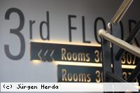 Sie verleihen dem funktionalistischen Gebäude eine beschwingte Fröhlichkeit, die die Prager Architektin Tereza Koucká und ihr Tek Tek Team mit viel Ausstattungsfantasie in die Postmoderne transponierte. Den Treppenaufgang zieren Spruchbinder mit Prager Charakteristika der Marke: „Wolfgang Amadeus Mozart führte seine Oper Don Giovanni in Prag ur auf.“ Zugegeben, kein Insidertipp, aber für die etwa 40 Prozent amerikanischen Backpacker sicher ein probates Mittel, um Wissenslücken zu füllen und die jungen Reisenden an die Hunderttürmige an der Moldau heranzuführen.