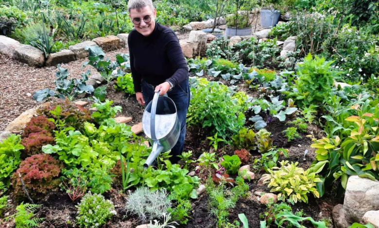 Die Gartenberaterin fördert das Wachstum im Kraterbeet, indem sie regelmäßig mit Beinwellblättern und Rasenschnitt mulcht. Nach der Ernte kurzlebiger Kulturen füllt sie die entstehenden Lücken mit neuen Jungpflanzen und setzt so den Erntezyklus fort.