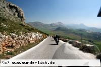 Auch Tag Nummer zwei sorgt für reichlich Kurzweil. Es geht entlang der Costa del Sol, die Sonnenküste macht ihrem Namen dabei alle Ehre. Die Küstenstraße schlängelt sich hoch über dem Wasser durch die Felsen, überrascht uns immer wieder mit hinreißenden Panoramen. Rechts unter uns liegt das dunkelblaue Meer, betupft mit weißen, schäumenden Kronen, links steigen mächtige Felswände in den nicht weniger blauen Himmel. In die Nase weht der Geruch von Salzwasser und der blühenden Macchia am Straßenrand. Kurz hinter Solobreña biegen wir ins Landesinnere ab, folgen dem Rio Guadalfeo durch das Tal. Bei Orgiva geht es in die Berge, in die Las Alpujarras, die südlichen Ausläufer der Sierra Nevada, die absolute Traumgegend für alle motorisierten Zweiradfahrer. Nicht umsonst haben fast alle kleinen Straßen dieser Region die zusätzliche grüne Markierung auf unserer Michelinkarte. In nicht enden wollendem Zickzack kurven wir durch die bergige Region. Kaum mal hundert Meter geht es geradeaus. Wir können uns nicht satt sehen an den Bergen rechts und links, mal grau und kahl, gespickt mit kantigem Fels, mal dicht bewachsen mit krüppeligen Bäumen und blühenden niedrigen Pflänzchen.