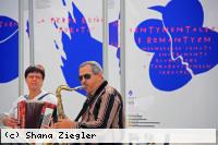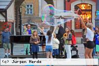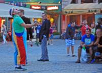 Doch dann wird‘s munter: Dahin eilende Banker werden von einem Mann mit bunt gestreifter Hose, Hütchen und roter Knollennase verfolgt. Der Clown wird zum Schatten der geschäftigen Manager, immer mehr Schaulustige bleiben stehen, lachen, bis sich auch die Anzugträger umdrehen: abrupter Stopp, Pan Klaun guckt demonstrativ in die Luft und pfeift sich eins. So geht das eine ganze Weile. Der Ring vereint die Menschen und der Clown hält das Treiben an. Der Spaßekenmacher schiebt Frauen beim Kinderwagenschieben an und imitiert den Gang von Halbstarken. Sein Publikum dankt‘s mit Gelächter und milden Gaben in den Hut.