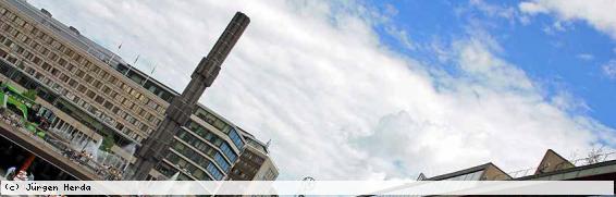 Die Skulptur vor dem Bahnhof, in dessen Jahrhundertwende-Hallen einige sehenswerte Jugendstil-Malereien zu bewundern sind, scheint zumindest den Bau- und Straßenlärm satt zu haben: Mit dicken roten Retro-Kopfhörern blickt sie verdrießlich auf das Viertel in Norrmalm, das in den 1950er Jahren, vorsichtig formuliert, einer Generalsanierung zum Opfer fiel. Das Kulturhus am Sergels Torg erkennt man an seiner großen Glasfassade, davor der 37,5 Meter hohe Glasobelisk in einem Brunnen, der nur nachts, wenn er von innen beleuchtet wird, tatsächlich eine gewisse Ausstrahlung besitzt. Tagsüber hat er den Charme eines Betonmonsters – wie viele der Kaufhäuser und Bürokomplexe, die ihn umzingeln.